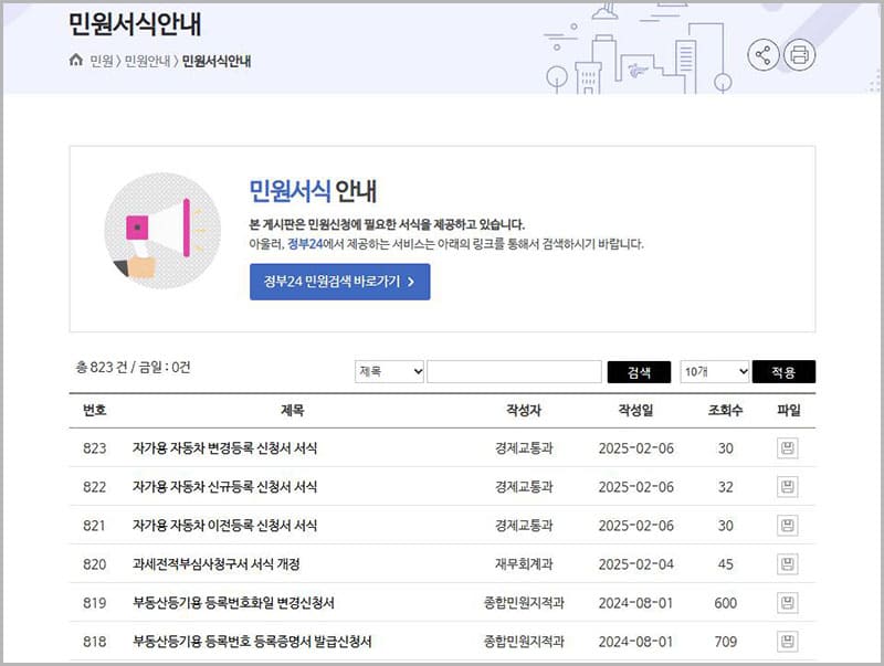 각종 민원 신청을 할 때 필요한 서식들을 모아 놓은 곳입니다. 민원시 관련 서식을 다운로드하여 작성 후 신청하시면 됩니다.