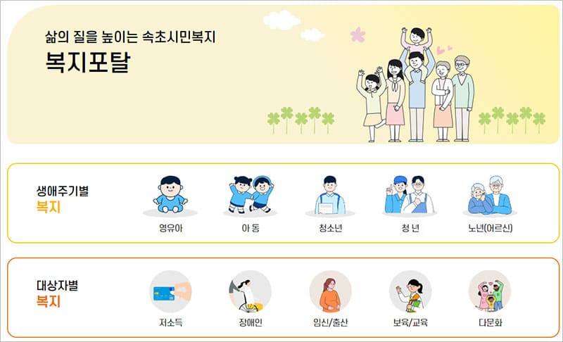속초시청의 복지 서비스는 생애주기별 복지로 영유아, 아동, 청소년, 청년, 노년(어르신)을 위한 서비스와 대상자별 복지로 저소득, 장애인, 임신/출산, 보육/교육, 다문화 가정을 위한 서비스가 있습니다. 각 분류별 복지 서비스는 다음과 같습니다.