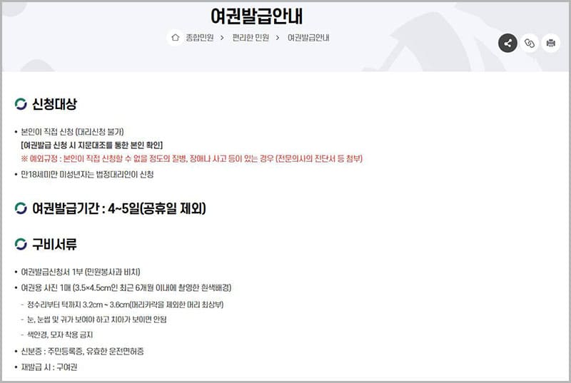 - 토/일/공휴일은 여권 접수 및 교부 등 여권 업무처리를 하지 않습니다.