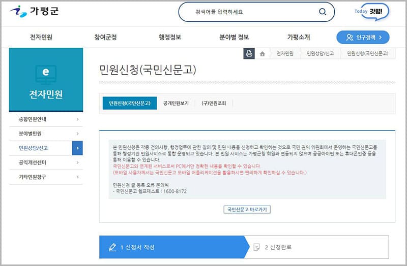 전국 지자체를 통해 개별적으로 제공되고 있던 온라인 민원신고센터 서비스가 정부 통합 국민신문고로 통합되었습니다. 이에 따라 가평군청 민원신청 서비스는 정부 통합 서비스인 국민신문고(www.epeople.go.kr) 홈페이지와 연동을 통해 접수하실 수 있습니다.