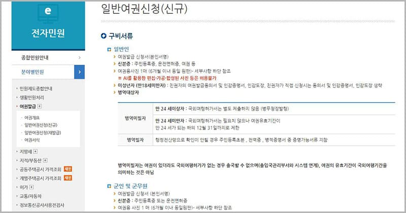 - 일반인 구비서류 : 여권발급 신청서(여권 민원서식 다운로드), 여권용 사진 2매(최근 6개월 이내 촬영한 사진), 신분증, 18세 이상 35세 이하 남자의 경우(군미필자 및 군복무를 마치지 아니한 자), 국외여행허가서(25세 이상 35세 이하), 기타 병역 관계 서류, 여권(유효기간이 경과하지 않은 경우)