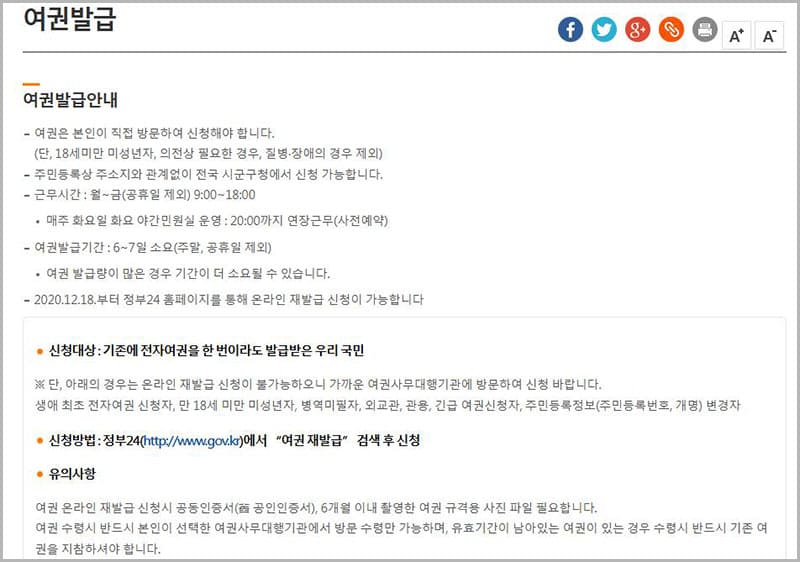 - 토/일/공휴일은 여권 접수 및 교부 등 여권 업무처리를 하지 않습니다.