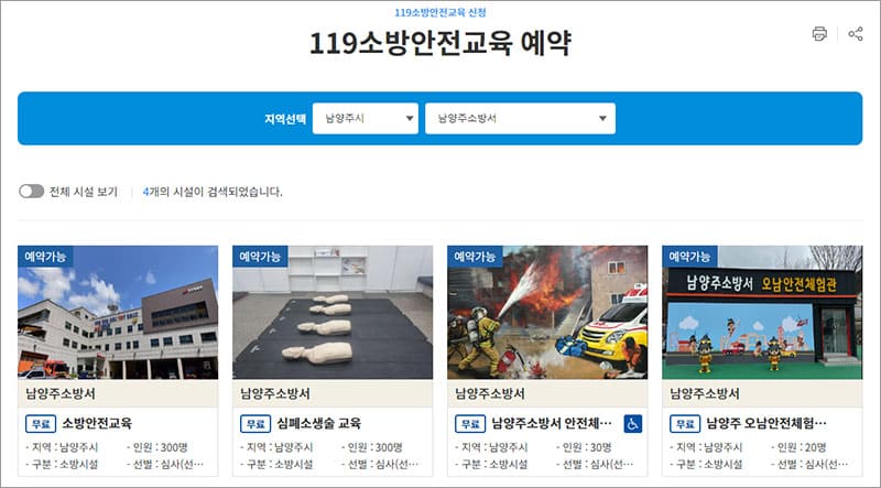 119소방안전교육은 도민의 안전 의식을 높이기 위한 프로그램입니다. 경기예약서비스 홈페이지에서는 소방안전교육에 대한 정보와 신청 방법을 안내합니다. 도민은 홈페이지를 통해 교육 일정과 내용을 확인하고, 참여 신청을 할 수 있습니다. 이 교육은 화재 예방 및 대처 방법을 배우는 기회를 제공하여, 도민의 안전을 강화하는 데 기여하고 있습니다.