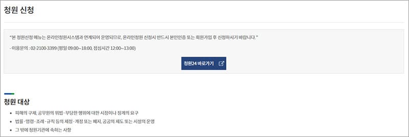 경기도청에서는 도민 피해의 구제, 공무원의 위법·부당한 행위에 대한 시정이나 징계의 요구 등 다양한 도민의 의견 수렴을 위해 청원 신청 제도를 운영하고 있습니다. 청원은 공공기관 온라인 청원 통합 시스템인 ‘청원24‘에서 진행되며, 제출된 청원은 관련 부서에서 검토한 후에 답변을 제공합니다.