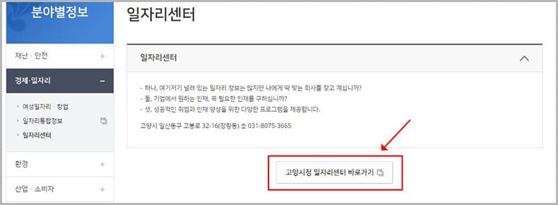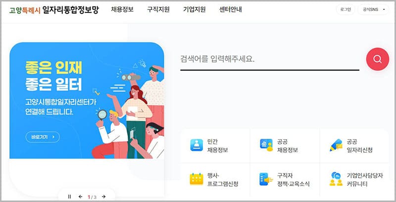 고양시청은 시민들의 채용 기회 및 삶의 질 향상을 위한 다양한 사업을 진행하고 있습니다. 그중에서 구인 구직 일자리 취업정보는 더욱 많은 분들이 양질의 일자리를 제공받을 수 있도록 일자리종합안내서, 구인정보, 직접일자리(공공근로 등), 노인일자리 등의 정보를 제공하고 있습니다.