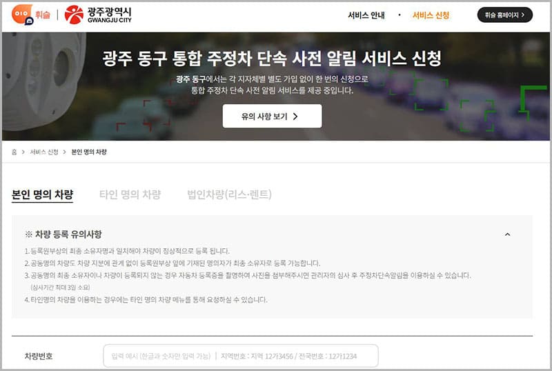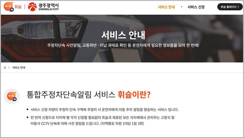 광주광역시 동구청에서는 관내 시민과 동구에 방문하시는 분들을 위해 본 서비스를 제공하고 있으며, 이를 통해 운전자의 편의성과 과태료 부과를 사전에 예방하고, 본의 아니게 불법 주정차를 하시는 분들에게 경각심을 줘서 이를 사전에 예방할 수 있는 유용한 제도입니다.