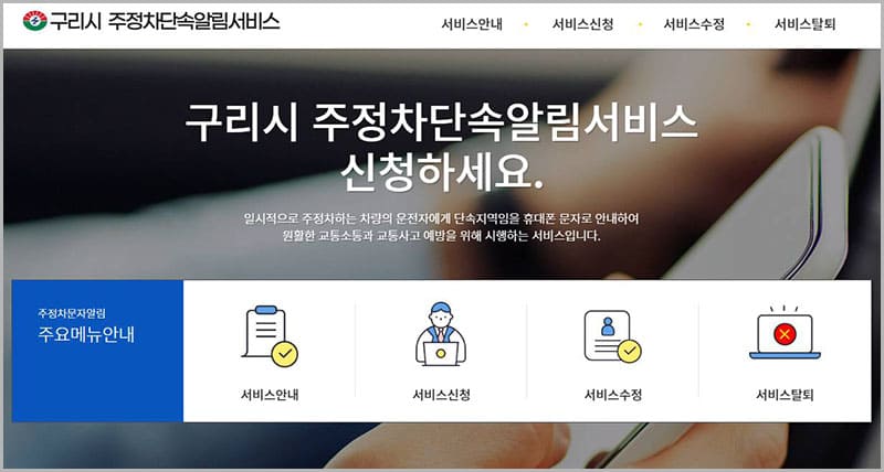 경기도 구리시청에서는 관내 시민과 구리시에 방문하시는 분들을 위해 본 서비스를 제공하고 있으며, 이를 통해 운전자의 편의성과 과태료 부과를 사전에 예방하고, 본의 아니게 불법 주정차를 하시는 분들에게 경각심을 줘서 이를 사전에 예방할 수 있는 유용한 제도입니다.