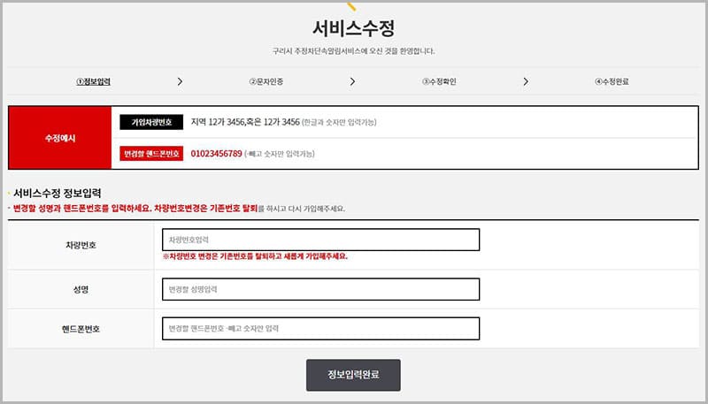주정차 단속 알림 서비스 수정은 신청자의 휴대폰 번호 또는 신청자 이름을 변경해야 할 경우 신청하실 수 있습니다. 신청자의 휴대폰 번호가 변경되었거나, 이름을 개명 또는 해당 차량번호를 다른 분 이름으로 등록하고 싶을 때 이용하시면 됩니다. 반면에, 차량번호 변경은 기존번호 탈퇴를 하신 후 서비스에 새로 가입해 주시기 바랍니다.