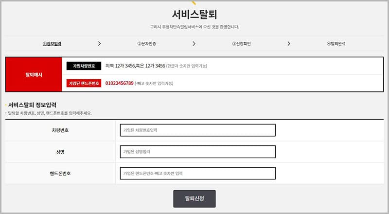 주정차 단속 알림서비스 탈퇴는 더 이상 해당 지역을 방문하지 않거나, 살지 않을 때, 차량번호를 새로 등록해야 할 때 필요합니다. 서비스를 탈퇴할 때는 가입 시 입력했던 차량번호, 성명, 휴대폰번호를 정확하게 기입한 후 탈퇴 신청 해주시기 바랍니다.