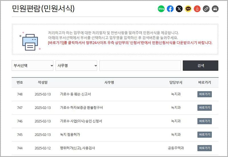 각종 민원 신청을 할 때 필요한 서식들을 모아 놓은 곳입니다. 민원시 관련 서식을 다운로드하여 작성 후 신청하시면 됩니다.