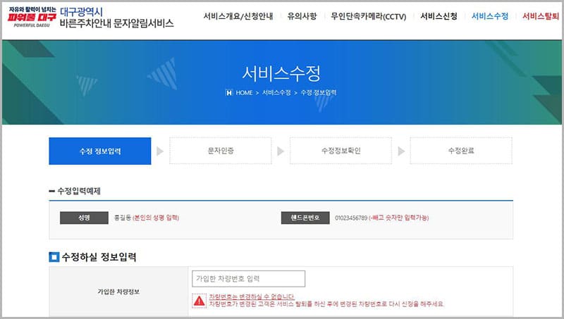 주정차 단속 알림 서비스 수정은 신청자의 휴대폰 번호 또는 신청자 이름을 변경해야 할 경우 신청하실 수 있습니다. 신청자의 휴대폰 번호가 변경되었거나, 이름을 개명 또는 해당 차량번호를 다른 분 이름으로 등록하고 싶을 때 이용하시면 됩니다. 반면에, 차량번호 변경은 기존번호 탈퇴를 하신 후 서비스에 새로 가입해 주시기 바랍니다.