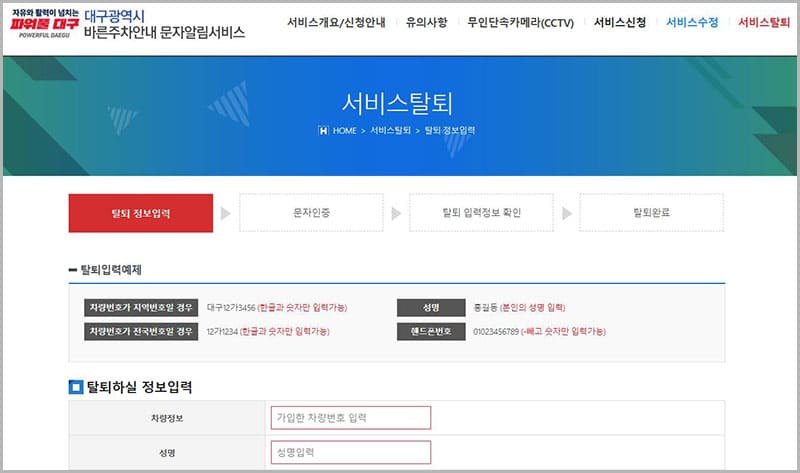 주정차 단속 알림서비스 탈퇴는 더 이상 해당 지역을 방문하지 않거나, 살지 않을 때, 차량번호를 새로 등록해야 할 때 필요합니다. 서비스를 탈퇴할 때는 가입 시 입력했던 차량번호, 성명, 휴대폰번호를 정확하게 기입한 후 탈퇴 신청 해주시기 바랍니다.