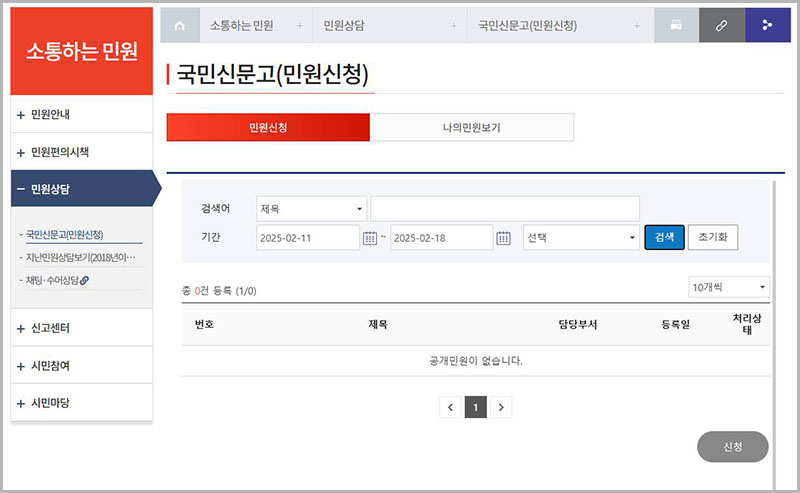 전국 지자체를 통해 개별적으로 제공되고 있던 온라인 민원신고센터 서비스가 정부 통합 국민신문고로 통합되었습니다. 이에 따라 밀양시청 민원신청 서비스는 정부 통합 서비스인 국민신문고(www.epeople.go.kr) 홈페이지와 연동을 통해 접수하실 수 있습니다.