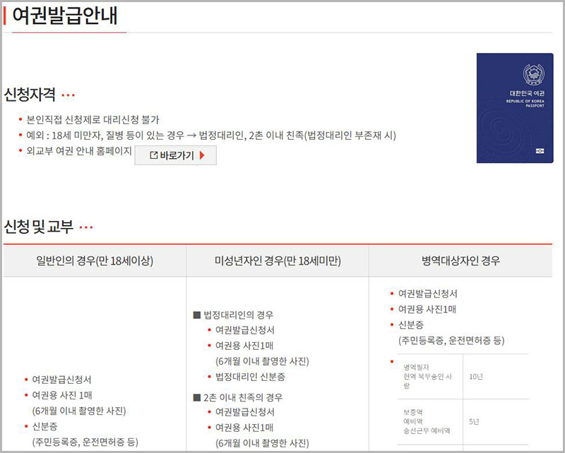 - 일반인 구비서류 : 여권발급 신청서(여권 민원서식 다운로드), 여권용 사진 2매(최근 6개월 이내 촬영한 사진), 신분증, 18세 이상 35세 이하 남자의 경우(군미필자 및 군복무를 마치지 아니한 자), 국외여행허가서(25세 이상 35세 이하), 기타 병역 관계 서류, 여권(유효기간이 경과하지 않은 경우)