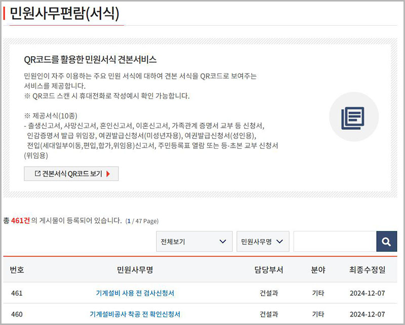 각종 민원 신청을 할 때 필요한 서식들을 모아 놓은 곳입니다. 민원시 관련 서식을 다운로드하여 작성 후 신청하시면 됩니다.