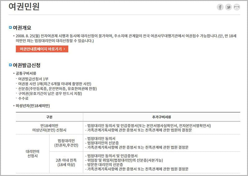 - 미성년자(18세 미만)의 경우 : 여권발급 동의서(부모, 친권자, 후견인 등 법정대리인), 동의자의 인감증명서(동의자가 직접 신청 시는 생략), 기본증명서 및 가족관계증명서(행정전산망으로 확인 발가능 시), 수수료(여권발급 수수료), 여권(유효기간이 경과하지 않은 경우)