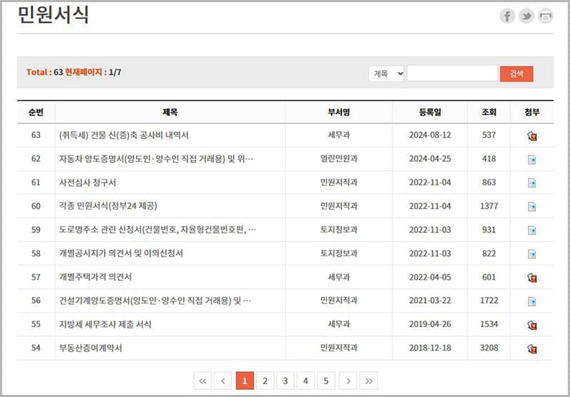 각종 민원 신청을 할 때 필요한 서식들을 모아 놓은 곳입니다. 민원시 관련 서식을 다운로드하여 작성 후 신청하시면 됩니다.
