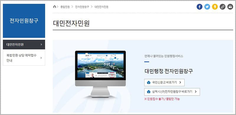 전국 지자체를 통해 개별적으로 제공되고 있던 온라인 민원신고센터 서비스가 정부 통합 국민신문고로 통합되었습니다. 이에 따라 삼척시청 민원신청 서비스는 정부 통합 서비스인 국민신문고(www.epeople.go.kr) 홈페이지와 연동을 통해 접수하실 수 있습니다.