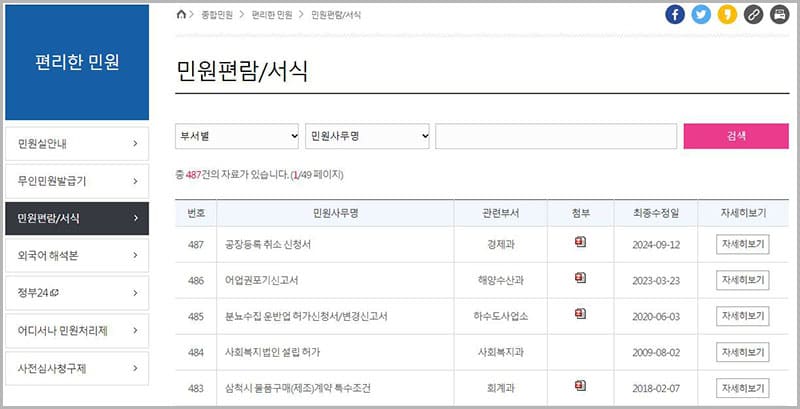 각종 민원 신청을 할 때 필요한 서식들을 모아 놓은 곳입니다. 민원시 관련 서식을 다운로드하여 작성 후 신청하시면 됩니다.