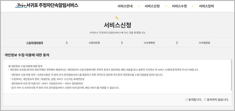 서귀포시 주정차단속 문자 알림 서비스 가입 페이지로 이동하신 후, 개인정보 수집 및 이용 정보 제공에 동의하시면 가입 절차를 진행할 수 있습니다. 서비스 가입 시에는 차량번호, 성명, 휴대폰번호를 정확하게 입력하셔야 제대로 된 알림 서비스를 받을 수 있습니다.