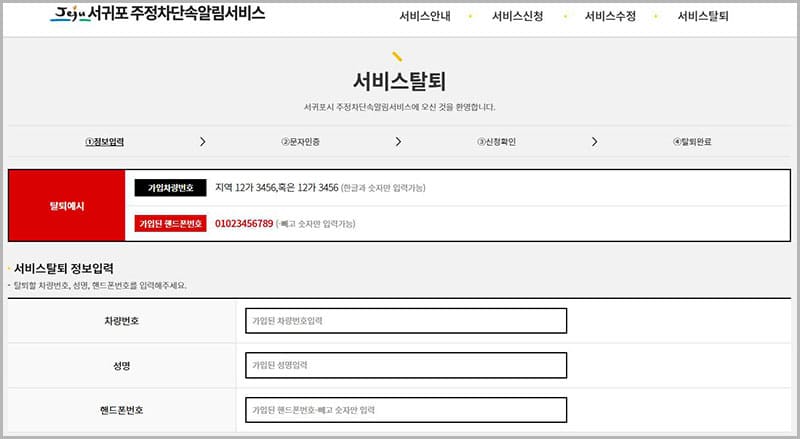 주정차 단속 알림서비스 탈퇴는 더 이상 해당 지역을 방문하지 않거나, 살지 않을 때, 차량번호를 새로 등록해야 할 때 필요합니다. 서비스를 탈퇴할 때는 가입 시 입력했던 차량번호, 성명, 휴대폰번호를 정확하게 기입한 후 탈퇴 신청 해주시기 바랍니다.