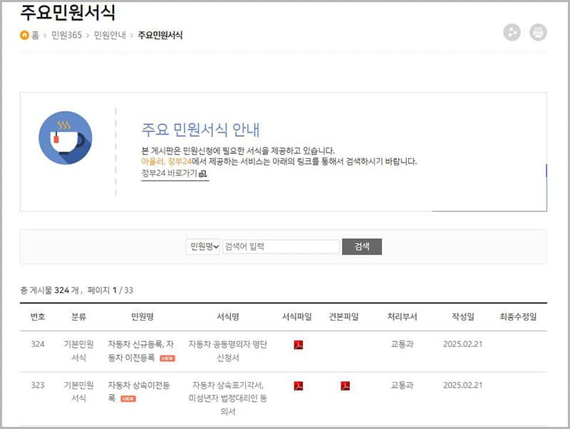 각종 민원 신청을 할 때 필요한 서식들을 모아 놓은 곳입니다. 민원시 관련 서식을 다운로드하여 작성 후 신청하시면 됩니다.