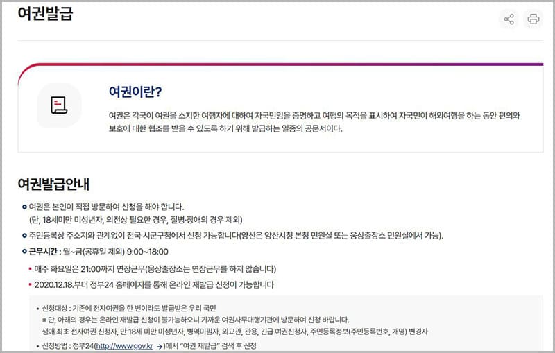 - 토/일/공휴일은 여권 접수 및 교부 등 여권 업무처리를 하지 않습니다.