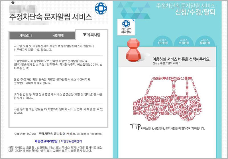 - 본 서비스는 등록차량 한 대에 서비스 수신 휴대폰 하나만 매칭이 가능합니다. 등록차량 한 대에 여러 휴대폰 번호를 입력하여 가입하신 경우, 오류로 인해 문자 발송이 이루어지지 않을 수 있으니 주의하시기 바랍니다.