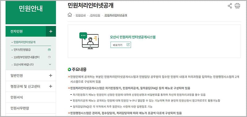 전국 지자체를 통해 개별적으로 제공되고 있던 온라인 민원신고센터 서비스가 정부 통합 국민신문고로 통합되었습니다. 이에 따라 오산시청 민원신청 서비스는 정부 통합 서비스인 국민신문고(www.epeople.go.kr) 홈페이지와 연동을 통해 접수하실 수 있습니다.