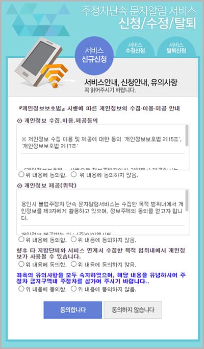 용인시청 주정차단속 알림서비스 가입 페이지로 이동하신 후, 개인정보 수집 및 이용 정보 제공에 동의하시면 가입 절차를 진행할 수 있습니다. 서비스 가입 시에는 차량번호, 성명, 휴대폰번호를 정확하게 입력하셔야 제대로 된 알림 서비스를 받을 수 있습니다.