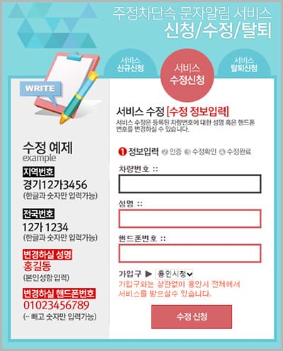 주정차 단속 알림 서비스 수정은 신청자의 휴대폰 번호 또는 신청자 이름을 변경해야 할 경우 신청하실 수 있습니다. 신청자의 휴대폰 번호가 변경되었거나, 이름을 개명 또는 해당 차량번호를 다른 분 이름으로 등록하고 싶을 때 이용하시면 됩니다. 반면에, 차량번호 변경은 기존번호 탈퇴를 하신 후 서비스에 새로 가입해 주시기 바랍니다.