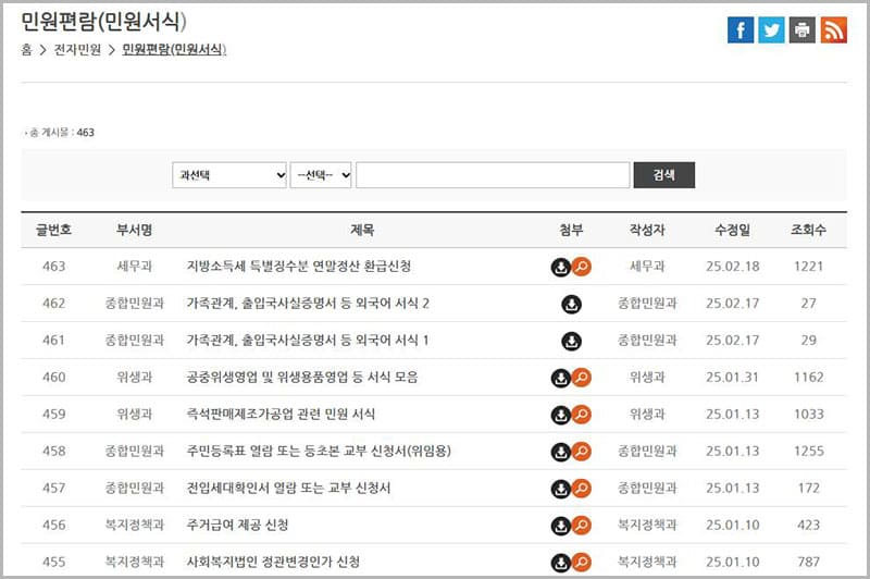 각종 민원 신청을 할 때 필요한 서식들을 모아 놓은 곳입니다. 민원시 관련 서식을 다운로드하여 작성 후 신청하시면 됩니다.