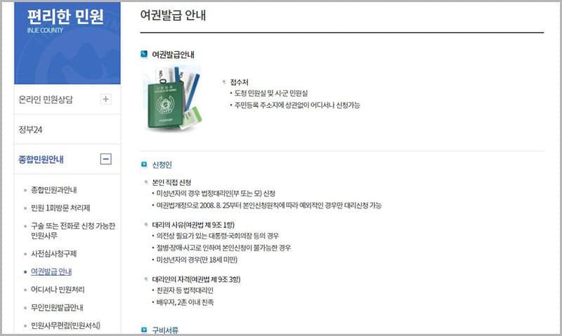 여권 발급은 인제군청 종합민원과에서 발급 가능하며, 평일 오전 09:00 ~ 18:00까지 운영하고 있습니다. 발급대상은 대한민국 국적을 보유한 일반 국민이며, 이중국적자, 불법체류자, 무국적자 등도 일정한 조건을 갖춘 경우 여권 또는 여행증명서를 발급받을 수 있습니다. 외국국적 취득으로 한국국적이 자동으로 상실된 후 한국여권을 계속 사용한 경우에는 출입국관리법 등 관련 규정에 의한 처벌대상이 될 수 있습니다.