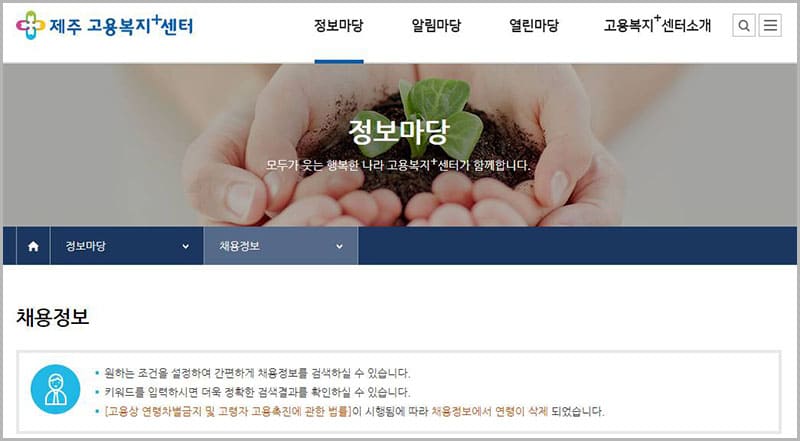 제주시는 시민들의 채용 기회 및 삶의 질 향상을 위한 다양한 사업을 진행하고 있으며, 그중에서 제주 고용복지센터를 통해 다양한 취업정보를 제공하고 있습니다. 조금이라도 더 많은 분들이 양질의 일자리를 얻을 수 있도록 채용정보, 인재정보, 각종 서식자료 등 다양한 정보를 제공하고 있습니다.