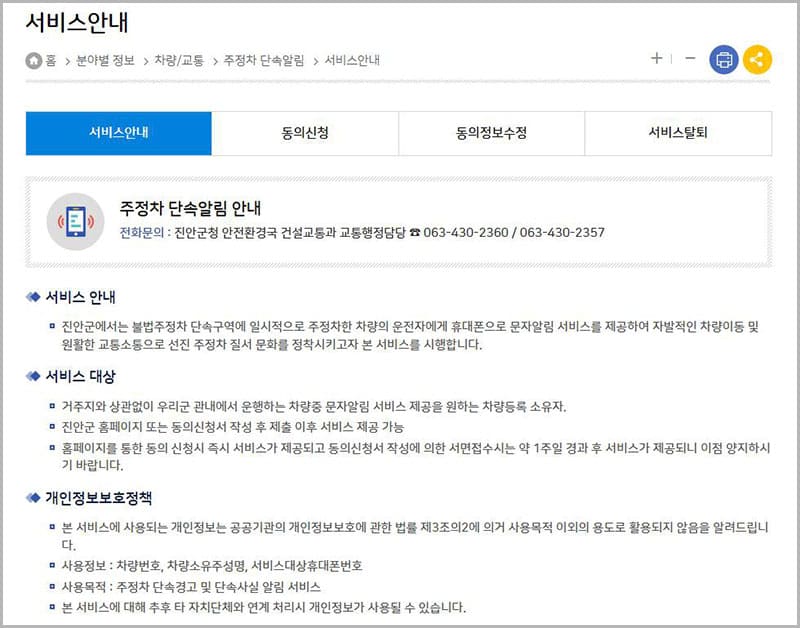 전북특별자치도 진안군청에서는 관내 시민과 진안군에 방문하시는 분들을 위해 본 서비스를 제공하고 있으며, 이를 통해 운전자의 편의성과 과태료 부과를 사전에 예방하고, 본의 아니게 불법 주정차를 하시는 분들에게 경각심을 줘서 이를 사전에 예방할 수 있는 유용한 제도입니다.