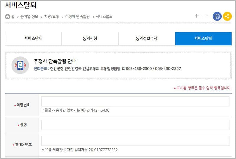 주정차 단속 알림서비스 탈퇴는 더 이상 해당 지역을 방문하지 않거나, 살지 않을 때, 차량번호를 새로 등록해야 할 때 필요합니다. 서비스를 탈퇴할 때는 가입 시 입력했던 차량번호, 성명, 휴대폰번호를 정확하게 기입한 후 탈퇴 신청 해주시기 바랍니다.