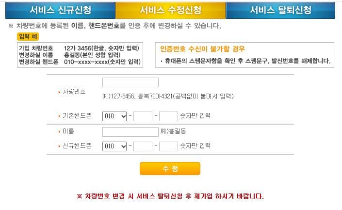 - 본 서비스는 등록차량 한 대에 서비스 수신 휴대폰 하나만 매칭이 가능합니다. 등록차량 한 대에 여러 휴대폰 번호를 입력하여 가입하신 경우, 오류로 인해 문자 발송이 이루어지지 않을 수 있으니 주의하시기 바랍니다.