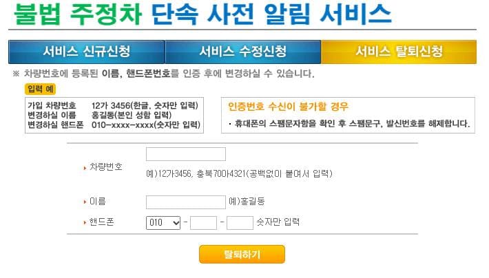 주정차 단속 알림서비스 탈퇴는 더 이상 해당 지역을 방문하지 않거나, 살지 않을 때, 차량번호를 새로 등록해야 할 때 필요합니다. 서비스를 탈퇴할 때는 가입 시 입력했던 차량번호, 성명, 휴대폰번호를 정확하게 기입한 후 탈퇴 신청 해주시기 바랍니다.