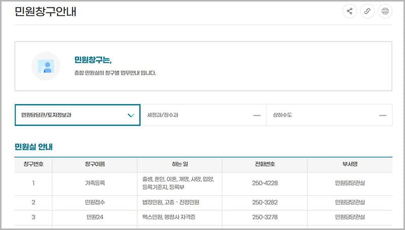 춘천시청 종합 민원실의 창구별 업무안내 및 전화번호 그리고 각 부서의 역할에 대해 안내해 드리고 있습니다. 각 창구별로 하는 일을 소개하고 실제 방문 시 헷갈리지 않고 바로 업무 처리를 하실 수 있습니다. 또한, 각 민원에 필요한 서류 및 수수료 등에 대해서도 안내해 드리고 있으니 참고하시기 바랍니다.