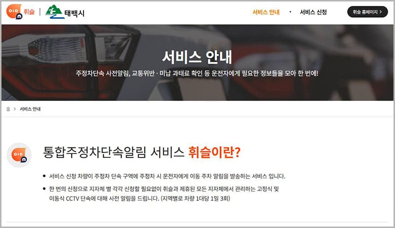 강원도 태백시청에서는 관내 시민과 태백시에 방문하시는 분들을 위해 본 서비스를 제공하고 있으며, 이를 통해 운전자의 편의성과 과태료 부과를 사전에 예방하고, 본의 아니게 불법 주정차를 하시는 분들에게 경각심을 줘서 이를 사전에 예방할 수 있는 유용한 제도입니다.